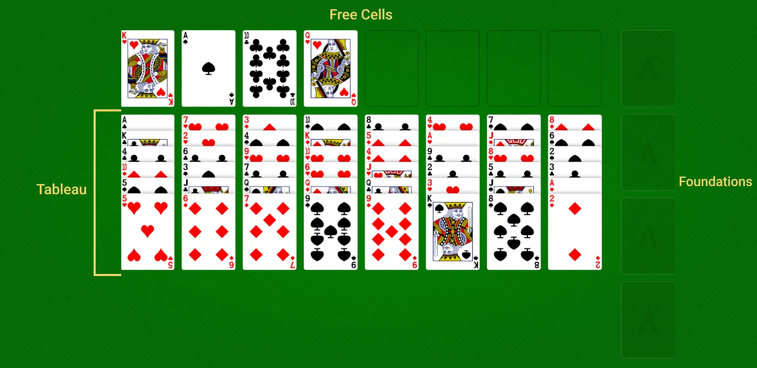- There are 4 foundation cells located to the right of the tableau. The goal is to build these foundations up in suit from Ace to King.