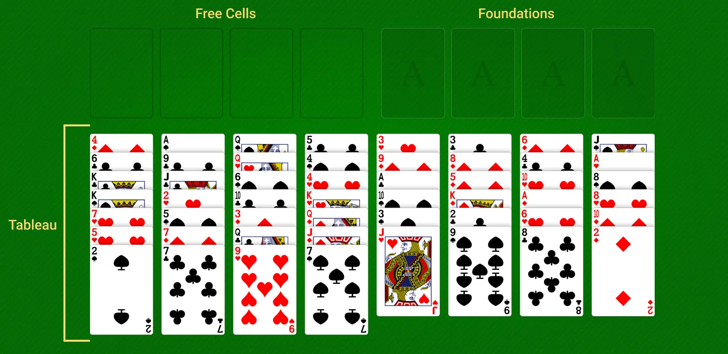FreeCell Solitaire uses a standard 52-card deck. Here’s how the game is set up: