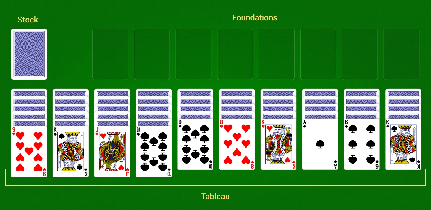 - Tableau piles are built down in the same suit(e.g., a 9♠ on a 10♠).